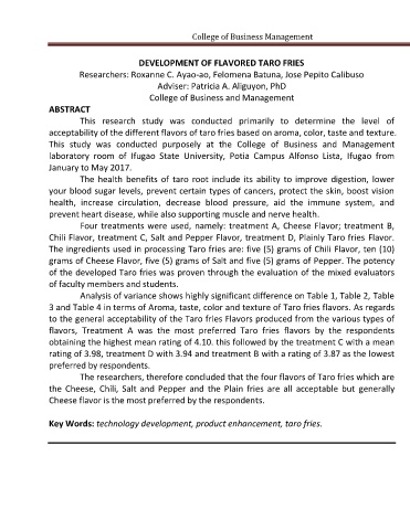 acceptability of the different flavors of taro fries based on aroma, color, taste and texture. ABSTRACT
