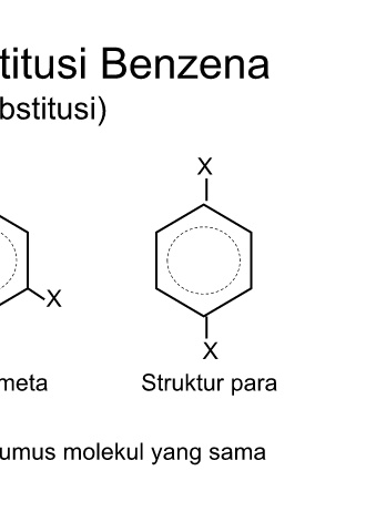 Isomer disubstitusi Benzena (dua substitusi) X X X X X X Struktur orto Struktur meta Struktur para Ketiga zat tentu memiliki rumus molekul yang sama