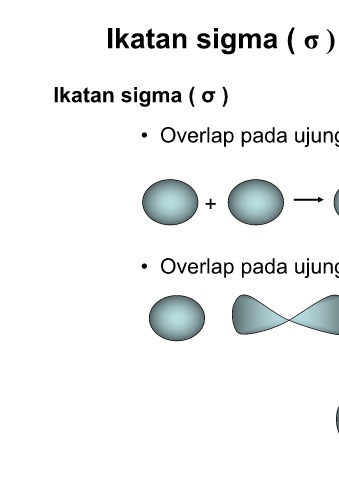 Ikatan sigma ( σ ) dan ikatan pi ( π ) Ikatan sigma ( σ ) • Overlap pada ujung orbital (Orbital s) + • Overlap pada ujung orbital (Orbital s dengan p)