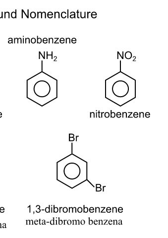 Aromatic Compound Nomenclature ethylbenzene aminobenzene CH CH 3 Cl NH 2 NO 2 2 chlorobenzene nitrobenzene Br Br 1 6 2 Br 5 3 Br 4 1,2-dibromobenzene 1,3-dibromobenzene Orto-dibromo benzena meta-dibromo benzena
