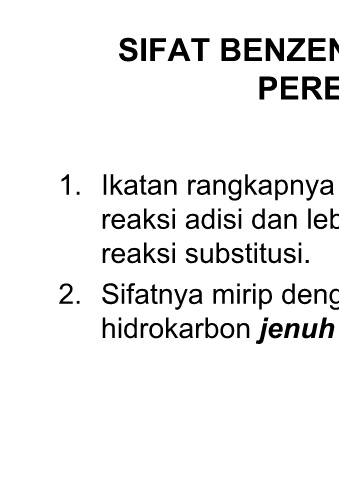 SIFAT BENZENA TERHADAP PEREAKSI 1. Ikatan rangkapnya sukar mengalami reaksi adisi dan lebih mudah mengalami reaksi substitusi. 2. Sifatnya mirip dengan senyawa hidrokarbon jenuh
