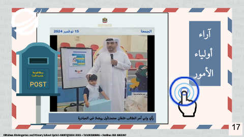 رسالة الجمعة آراء من بريد الأسرة أولياء الأمور رأي ولي أمر الطالب خلفان محمد(أول روضة) في المبادرة 17 AlNahwa Kindergarten and Primary School Cycle1-10007@2024-2025 – Tel:092380906 – Hotline: 050 4882297
