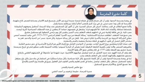 كلمة مديرة المدرسة 5 AlNahwa Kindergarten and Primary School Cycle1-10007@2024-2025 – Tel:092380906 – Hotline: 050 4882297