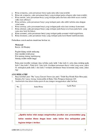 h.  Rima disonansi, yaitu persamaan bunyi yang terdapat pada huruf-huruf mati/konsonan.