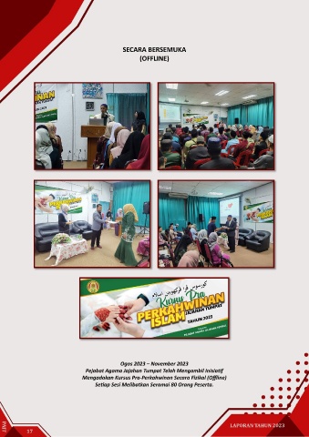 SECARA BERSEMUKA (OFFLINE) Ogos 2023 – November 2023 Pejabat Agama Jajahan Tumpat Telah Mengambil Inisiatif Mengadakan Kursus Pra-Perkahwinan Secara Fizikal (Offline) Setiap Sesi Melibatkan Seramai 80 Orang Peserta. LAPORAN TAHUN 2023 PAJT 17
