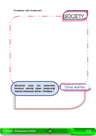 Perhatikan video berikut ini ! SOCIETY Setujukah anda, jika masyarakat Tahap Aplikasi berperan penting dalam mengurangi dampak pemanasan global ? Mengapa ? E-Modul - Pemanasan Global 22 VII