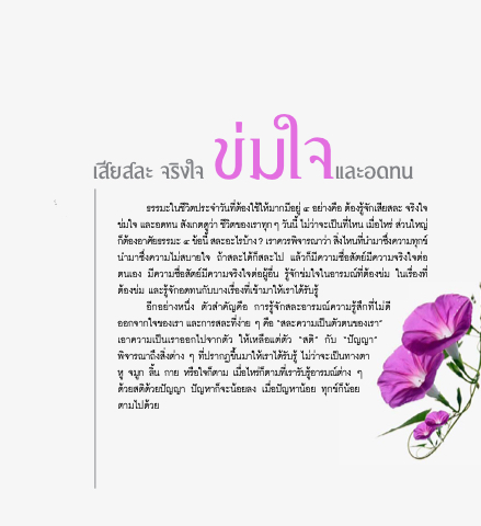 ธรรมะในัช่วิ่ ติ ประจิาํา วินัั ทต่ อ้ งใช่ใ้ หม้ ากมอ่ ยู่ ๔ อยา่ งคอ่ ตอ้ งรจิู้ กั เสย่ สละ จิรงิ ใจิ ข์ม่ ใจิ และอดทนั สงั เกตดวิู า่ ช่วิ่ ติ ข์องเราทกุ ๆ วินัั นั่ ไมวิ่ า่ จิะเปนั็ ทไ่ หนั เมอ่ ไหร่ สวิ่ นัใหญ่่ กต็ อ้ งอาศยั ธรรมะ ๔ ข์อ้ นั่ สละอะไรบา้ ง ? เราควิรพจิิ ารณาวิา่ สงิ ไหนัทนั่ าํา มาซึ่งึ ควิามทกุ ข์์ นัําามาซึ่ึงควิามไม่สบายใจิ ถ้้าสละได้ก็สละไป แล้วิก็ม่ควิามซึ่่อสัตย์ม่ควิามจิริงใจิต่อ ตนัเอง ม่ควิามซึ่่อสัตย์ม่ควิามจิริงใจิต่อผู่้อ่นั รู้จิักข์่มใจิในัอารมณท์ ่ต้องข์่ม ในัเร่องท่ ต้องข์่ม และรู้จิักอดทนักับบางเร่องท่เข์้ามาให้เราไดร้ ับรู้