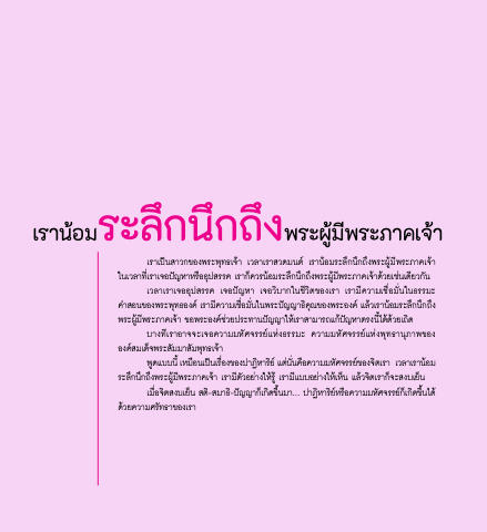 เราเป็นัสาวิกข์องพระพุทธเจิ้า เวิลาเราสวิดมนัต์ เรานั้อมระลึกนัึกถ้ึงพระผู่้ม่พระภาคเจิ้า ในัเวิลาท่เราเจิอปญ่ั หาหร่ออุปสรรค เราก็ควิรนั้อมระลึกนัึกถ้ึงพระผู่้มพ่ ระภาคเจิ้าด้วิยเช่่นัเด่ยวิกันั