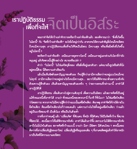 การท่เรากําาหนัดรู้ แล้วิ “เปล่ยนัจิิต” ท่คับแคบ ท่หนััก ท่ม่ตัวิตนั ให้เปนั็ จิิตท่กวิ้าง ท่สบาย ทอ่ สิ ระได...้ ตรงนัอ่ ยากใหโ้ ยคพ่ จิิ ารณาจิรงิ จิงั เราทาํา ไดแ้ ลวิ้ เรากท็ งิ เพราะเราไมไ่ ดพ้ จิิ ารณาจิรงิ จิงั เราถ้ึงไม่มันัใจิในัตวิั เอง สภาพจิิตท่กวิ้างแบบนั่ ถ้ามวิ่า ม่เรา ม่อัตตา ม่ตัวิตนัไหม ? ตรงนั่แหละ คอ่ การทเ่ ราเปลย่ นัทฏิิ ฐข์ิ องเราใหม่ เปลย่ นัทฏิิ ฐหิ รอ่ มมุ มองเดมิ ๆ ทเ่ ราเคยตดิ อยแู่ ลวิ้ ทาํา ใหเ้ ราหนักั มาเป็นัจิิตทม่ ่ควิามเบาและอิสระ