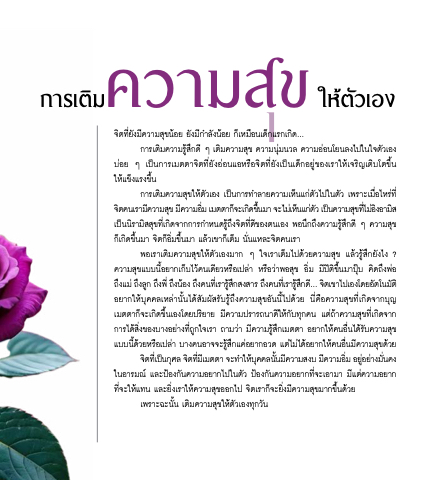 การเติมควิามสข์ุ ใหต้ ัวิเอง เปนั็ การทําาลายควิามเห็นัแก่ตัวิไปในัตวิั เพราะเม่อไหรท่ ่ จิติ คนัเรามค่ วิามสข์ุ มค่ วิามอมิ เมตตากจิ็ ะเกดิ ข์นัึ มา จิะไมเ่ หนั็ แกต่ วิั เปนั็ ควิามสข์ุ ทไ่ มอ่ งิ อามสิ เป็นันัิรามิสสข์ุ ท่เกิดจิากการกําาหนัดรู้ถ้ึงจิิตท่ด่ข์องตนัเอง พอนัึกถ้ึงควิามรู้สึกด่ ๆ ควิามสุข์ ก็เกิดข์ึนัมา จิิตกอ็ ิมข์นัึ มา แล้วิเข์าก็เต็ม นัันัแหละจิิตคนัเรา