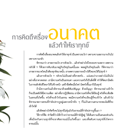 การคดิ ถ้งึ เรอ่ งอนัาคตแลวิ้ ทาํา ใหเ้ ราทกุ ข์์ เปนั็ เพราะอะไร ? เพราะควิามอยากมากเกนัิ ไป เพราะควิามกลวิั