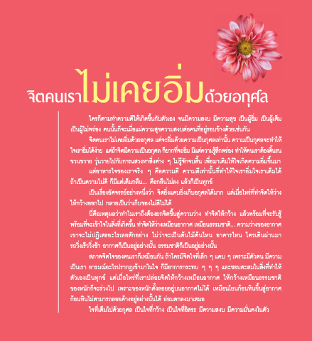 จิติ คนัเราไมเ่ คยอมิ ดวิ้ ยอกศุ ล แตจิ่ ะอมิ ดวิ้ ยควิามเป็นักศุ ลเทา่ นันัั ควิามเปนั็ กศุ ลจิะทาํา ให้ ใจิเราอมิ ไดง้ า่ ย แตถ้่ า้ จิติ มค่ วิามเปนั็ อกศุ ล กย็ ากทจิ่ ะอมิ มแ่ ตค่ วิามรสู้ กึ พรอ่ ง ทาํา ใหค้ นัเราตอ้ งดนัิ รนั ข์วินัข์วิาย วิุ่นัวิายไปกับการแสวิงหาสิงต่าง ๆ ไมร่ ู้จิักจิบสินั เพ่อมาเติมให้ใจิเกิดควิามอิมข์ึนัมา
