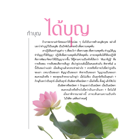เราปฏิบิ ตั แิ ละทาํา บญุ่ ตา่ ง ๆ เพอ่ อะไร ? เพอ่ ควิามสข์ุ เพอ่ ควิามหลดุ พนั้ ทาํา บญุ่ ไดบ้ ญุ่ ทําาปัญ่ญ่าก็ได้ปัญ่ญ่า ปฏิิบัติเพ่อควิามหลุดพ้นัก็ได้หลุดพ้นั เราจิะหลุดพ้นัได้ก็ต้องปฏิิบัติ ค่อการพัฒนัาจิิตเราใหม้ ่ปัญ่ญ่ามากข์ึนั ให้รู้ตามควิามเป็นัจิริงท่เรย่ กวิ่า “สัมมาทิฎฐิ” ค่อ การเหนั็ ช่อบ การเหนั็ ช่อบคอ่ การเหนั็ ถ้กู เหนั็ วิา่ รปู นัามอนัั นัเ่ ปนั็ คนัละสวิ่ นักนัั สงั ข์ารข์นัั ธ์ ๕ นั่เป็นัข์องวิ่างเปล่า เม่อเห็นัถู้กแล้วิควิรจิะทําาอย่างไร ? ควิรหร่อท่เราจิะไปยึดวิ่ารูปเป็นั ข์องเรา เวิทนัาเป็นัข์องเรา สัญ่ญ่าเป็นัข์องเรา สังข์ารเป็นัข์องเรา วิิญ่ญ่าณเป็นัข์องเรา สมควิรแล้วิหร่อ ? พระพุทธเจิ้าทรงถ้ามภิกษวิุ ่า เม่อไม่เท่ยง เปนั็ ทุกข์์หร่อเป็นัสุข์เล่า ? ภิกษุก็บอกวิ่าเปนั็ทุกข์์เม่อเป็นัทุกข์์เป็นัอัตตาหร่ออนััตตา?เม่อเกิดข์นัึ ตังอยู่แล้วิก็ดับไป