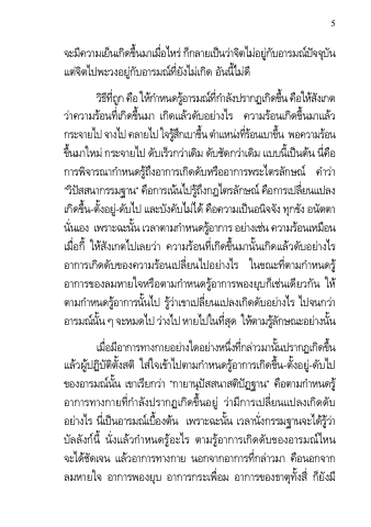 วธิ ที ถี่ กู คอื ใหก้ ํา หนดรอู้ ํารมณท์ กี่ ํา ลงั ปรํากฏเกดิ ขนึ้ คอื ใหส้ งั เกต ว่ําควํามร้อนที่เกิดขึ้นมํา เกิดแล้วดับอย่ํางไร ควํามร้อนเกิดขึ้นมําแล้ว กระจํายไป จํางไป คลํายไป ใจรสู้ กึ เบําขนึ้ ตํา แหนง่ ทรี่ อ้ นเบําขนึ้ พอควํามรอ้ น ขึ้นมําใหม่ กระจํายไป ดับเร็วกว่ําเดิม ดับชัดกว่ําเดิม แบบนี้เป็นต้น นี่คือ กํารพิจํารณํากําหนดรู้ถึงอํากํารเกิดดับหรืออํากํารพระไตรลักษณ์ คําว่ํา “วปิ สั สนํากรรมฐําน” คอื กํารเนน้ ไปรถู้ งึ กฎไตรลกั ษณ์ คอื กํารเปลยี่ นแปลง เกดิ ขนึ้ -ตงั้ อย-ู่ ดบั ไป และบงั คบั ไมไ่ ด้ คอื ควํามเปน็ อนจิ จงั ทกุ ขงั อนตั ตํา นนั่ เอง เพรําะฉะนนั้ เวลําตํามกํา หนดรอู้ ํากําร อยํา่ งเชน่ ควํามรอ้ นเหมอื น เมื่อกี้ ให้สังเกตไปเลยว่ํา ควํามร้อนที่เกิดขึ้นมํานั้นเกิดแล้วดับอย่ํางไร อํากํารเกิดดับของควํามร้อนเปลี่ยนไปอย่ํางไร ในขณะที่ตํามกําหนดรู้ อํากํารของลมหํายใจหรือตํามกําหนดรู้อํากํารพองยุบก็เช่นเดียวกัน ให้ ตํามกําหนดรู้อํากํารนั้นไป รู้ว่ําเขําเปลี่ยนแปลงเกิดดับอย่ํางไร ไปจนกว่ํา อํารมณน์ นั้ ๆ จะหมดไป วํา่ งไป หํายไปในทสี่ ดุ ใหต้ ํามรลู้ กั ษณะอยํา่ งนนั้