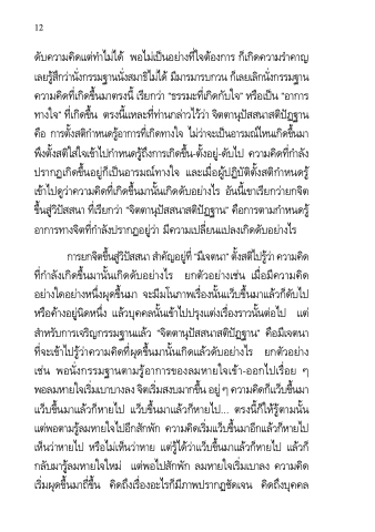 ดับควํามคิดแต่ทําไม่ได้ พอไม่เป็นอย่ํางที่ใจต้องกําร ก็เกิดควํามรําคําญ เลยรู้สึกว่ํานั่งกรรมฐํานนั่งสมําธิไม่ได้ มีมํารมํารบกวน ก็เลยเลิกนั่งกรรมฐําน ควํามคิดที่เกิดขึ้นมําตรงนี้ เรียกว่ํา “ธรรมะที่เกิดกับใจ” หรือเป็น “อํากําร ทํางใจ” ที่เกิดขึ้น ตรงนี้แหละที่ท่ํานกล่ําวไว้ว่ํา จิตตํานุปัสสนําสติปัฏฐําน คือ กํารตั้งสติกําหนดรู้อํากํารที่เกิดทํางใจ ไม่ว่ําจะเป็นอํารมณ์ไหนเกิดขึ้นมํา พงึ ตงั้ สตใิ สใ่ จเขํา้ ไปกํา หนดรถู้ งึ กํารเกดิ ขนึ้ -ตงั้ อย-ู่ ดบั ไป ควํามคดิ ทกี่ ํา ลงั ปรํากฏเกิดขึ้นอยู่ก็เป็นอํารมณ์ทํางใจ และเมื่อผู้ปฏิบัติต้ังสติกําหนดรู้ เข้ําไปดูว่ําควํามคิดที่เกิดขึ้นมํานั้นเกิดดับอย่ํางไร อันนี้เขําเรียกว่ํายกจิต ขึ้นสู่วิปัสสนํา ที่เรียกว่ํา “จิตตํานุปัสสนําสติปัฏฐําน” คือกํารตํามกําหนดรู้ อํากํารทํางจิตที่กําลังปรํากฏอยู่ว่ํา มีควํามเปลี่ยนแปลงเกิดดับอย่ํางไร