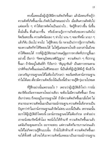 ตรงนี้แหละเมื่อผู้ปฏิบัติมีควํามคิดเกิดขึ้นมํา แล้วมีเจตนําที่จะรู้ว่ํา ควํามคิดที่เกิดขึ้นมํานั้น เกิดดับในลักษณะอย่ํางไร เมื่อเห็นควํามคิดดับไป แต่ละครั้ง ๆ ทําให้สภําพจิตใจเป็นอย่ํางไร... จิตรู้สึกสว่ํางขึ้น นิ่งขึ้น ตั้งมั่นขึ้น ตื่นตัวมํากขึ้น หรือยิ่งตํามรู้อํากํารเกิดดับของควํามคิดไป จิตเริ่มสงบขึ้น ควํามคิดน้อยลง ๆ ห่ํางไป นําน ๆ จะมําทีหนึ่ง มําเบํา ๆ แล้วก็ดับ เงียบไป หํายไป ใจรู้สึกสงบ นิ่ง กลํายเป็นว่ํากํารรู้อํากํารเกิดดับ ของควํามคิดก็ทําให้จิตสงบได้ ไม่ใช่รู้แค่ลมหํายใจเข้ํา-ออกเท่ํานั้นถึงจะ ทําให้จิตสงบได้ กํารที่ผู้ปฏิบัติธรรมกําหนดรู้ดูอํากํารทํางจิตที่ปรํากฏขึ้นมํา อย่ํางนี้ เรียกว่ํา “จิตตํานุปัสสนําสติปัฏฐําน” ควํามคิดเก่ํา ๆ ที่ปรํากฏ ขึ้นมํา ถ้ําจัดอยู่ในขันธ์ห้ํา ก็เรียกว่ํา “สัญญําขันธ์” เป็นสภําวธรรมตําม ปกติที่จะเกิดขึ้นแน่นอนในชีวิตของเรํา นี่เป็นสิ่งที่ผู้ปฏิบัติพึงรู้ พึงเข้ําใจ เวลําเจริญกรรมฐํานจะได้ไม่ต้องไปกังวลว่ํา พอเริ่มหลับตํานั่งกรรมฐําน ทําไม่ได้เลย เดี๋ยวมีควํามคิดเรื่องโน้นเรื่องนี้เข้ํามํา จนรู้สึกวุ่นวํายไปหมด