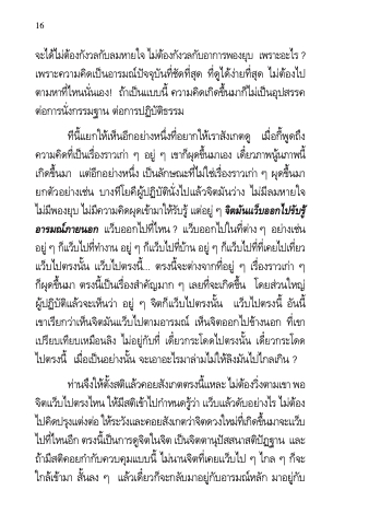 ทํา่ นจงึ ใหต้ งั้ สตแิ ลว้ คอยสงั เกตตรงนแี้ หละ ไมต่ อ้ งวงิ่ ตํามเขํา พอ จิตแว็บไปตรงไหน ให้มีสติเข้ําไปกําหนดรู้ว่ํา แว็บแล้วดับอย่ํางไร ไม่ต้อง ไปคดิ ปรงุ แตง่ ตอ่ ใหร้ ะวงั และคอยสงั เกตวํา่ จติ ดวงใหมท่ เี่ กดิ ขนึ้ มําจะแวบ็ ไปที่ไหนอีก ตรงนี้เป็นกํารดูจิตในจิต เป็นจิตตํานุปัสสนําสติปัฏฐําน และ ถ้ํามีสติคอยกํากับควบคุมแบบนี้ ไม่นํานจิตที่เคยแว็บไป ๆ ไกล ๆ ก็จะ ใกล้เข้ํามํา สั้นลง ๆ แล้วเดี๋ยวก็จะกลับมําอยู่กับอํารมณ์หลัก มําอยู่กับ