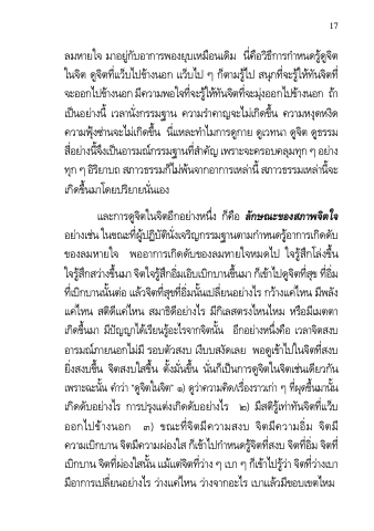 ลมหํายใจ มําอยู่กับอํากํารพองยุบเหมือนเดิม นี่คือวิธีกํารกําหนดรู้ดูจิต ในจิต ดูจิตที่แว็บไปข้ํางนอก แว็บไป ๆ ก็ตํามรู้ไป สนุกที่จะรู้ให้ทันจิตที่ จะออกไปขํา้ งนอก มคี วํามพอใจทจี่ ะรใู้ หท้ นั จติ ทจี่ ะมงุ่ ออกไปข้ํางนอก ถํา้ เป็นอย่ํางนี้ เวลํานั่งกรรมฐําน ควํามรําคําญจะไม่เกิดขึ้น ควํามหงุดหงิด ควํามฟุ้งซ่ํานจะไม่เกิดขึ้น นี่แหละทําไมกํารดูกําย ดูเวทนํา ดูจิต ดูธรรม สอี่ ยํา่ งนจี้ งึ เปน็ อํารมณก์ รรมฐํานทสี่ ํา คญั เพรําะจะครอบคลมุ ทกุ ๆ อยํา่ ง ทกุ ๆ อริ ยิ ําบถ สภําวธรรมกไ็ มพ่ น้ จํากอํากํารเหลํา่ นี้ สภําวธรรมเหลํา่ นจี้ ะ เกิดขึ้นมําโดยปริยํายนั่นเอง