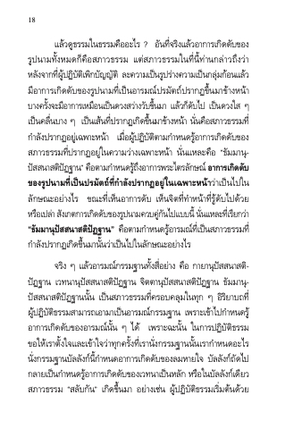 แล้วดูธรรมในธรรมคืออะไร ? อันที่จริงแล้วอํากํารเกิดดับของ รูปนํามทั้งหมดก็คือสภําวธรรม แต่สภําวธรรมในที่นี้ท่ํานกล่ําวถึงว่ํา หลังจํากที่ผู้ปฏิบัติเพิกบัญญัติ ละควํามเป็นรูปร่ํางควํามเป็นกลุ่มก้อนแล้ว มีอํากํารเกิดดับของรูปนํามที่เป็นอํารมณ์ปรมัตถ์ปรํากฏขึ้นมําข้ํางหน้ํา บํางครั้งจะมีอํากํารเหมือนเป็นดวงสว่ํางวับขึ้นมํา แล้วก็ดับไป เป็นดวงใส ๆ เป็นคลื่นบําง ๆ เป็นเส้นที่ปรํากฏเกิดขึ้นมําข้ํางหน้ํา นั่นคือสภําวธรรมที่ กําลังปรํากฏอยู่เฉพําะหน้ํา เมื่อผู้ปฏิบัติตํามกําหนดรู้อํากํารเกิดดับของ สภําวธรรมที่ปรํากฏอยู่ในควํามว่ํางเฉพําะหน้ํา นั่นแหละคือ “ธัมมํานุ- ปัสสนําสติปัฏฐําน” คือตํามกําหนดรู้ถึงอํากํารพระไตรลักษณ์ อาการเกิดดับ ของรูปนามที่เป็นปรมัตถ์ที่กาลังปรากฏอยู่ในเฉพาะหน้าว่ําเป็นไปใน ลักษณะอย่ํางไร ขณะที่เห็นอํากํารดับ เห็นจิตที่ทําหน้ําที่รู้ดับไปด้วย หรอื เปลํา่ สงั เกตกํารเกดิ ดบั ของรปู นํามควบคกู่ นั ไปแบบนี้ นนั่ แหละทเี่ รยี กวํา่ “ธัมมานุปัสสนาสติปัฏฐาน” คือตํามกําหนดรู้อํารมณ์ที่เป็นสภําวธรรมที่ กําลังปรํากฏเกิดขึ้นมํานั้นว่ําเป็นไปในลักษณะอย่ํางไร