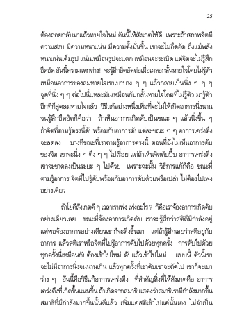 ต้องถอยกลับมําแล้วหํายใจใหม่ อันนี้ให้สังเกตให้ดี เพรําะถ้ําสภําพจิตมี ควํามสงบ มีควํามหนําแน่น มีควํามตั้งมั่นขึ้น เขําจะไม่อึดอัด ถึงแม้พลัง หนําแนน่ เตม็ รปู แนน่ เหมอื นรปู จะแตก เหมอื นจะระเบดิ แตจ่ ติ จะไมร่ สู้ กึ อึดอัด อันนี้ควํามแตกต่ําง! จะรู้สึกอึดอัดต่อเมื่อเผลอกลั้นหํายใจโดยไม่รู้ตัว เหมือนอํากํารของลมหํายใจเขําเบําบําง ๆ ๆ แล้วกลํายเป็นนิ่ง ๆ ๆ ๆ จุดที่นิ่ง ๆ ๆ ต่อไปนี่แหละมันเหมือนกับกลั้นหํายใจโดยที่ไม่รู้ตัว มํารู้ตัว อีกทีก็สูดลมหํายใจแล้ว วิธีแก้อย่ํางหนึ่งเพื่อที่จะไม่ให้เกิดอํากํารนิ่งนําน จนรู้สึกอึดอัดก็คือว่ํา ถ้ําเห็นอํากํารเกิดดับเป็นขณะ ๆ แล้วนิ่งขึ้น ๆ ถ้ําจิตที่ตํามรู้ตรงนี้ดับพร้อมกับอํากํารดับแต่ละขณะ ๆ ๆ อํากํารเคร่งตึง จะลดลง บํางทีขณะที่เรําตํามรู้อํากํารตรงนี้ ตอนที่ยังไม่เห็นอํากํารดับ ของจิต เขําจะนิ่ง ๆ ตึง ๆ ๆ ไปเรื่อย แต่ถ้ําเห็นจิตดับปึ๊บ อํากํารเคร่งตึง เขําจะขําดลงเป็นระยะ ๆ ไปด้วย เพรําะฉะนั้น วิธีกํารแก้ก็คือ ขณะที่ ตํามรู้อํากําร จิตที่ไปรู้ดับพร้อมกับอํากํารดับด้วยหรือเปล่ํา ไม่ต้องไปเพ่ง อย่ํางเดียว
