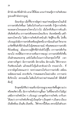ยอ้ นกลบั มํา เมอื่ กที้ อี่ ําจํารยพ์ ดู วํา่ ขณะกํา หนดรลู้ มหํายใจแลว้ มี อํากํารเคร่งตึงเกิดขึ้นมํา ไม่ต้องไปกังวลกับอํากํารเคร่งตึง ถ้ํารู้อํากํารเกิดดับ ของลมหํายใจจนลมหํายใจหํายไปว่ํางไป เมื่อไหร่ที่เห็นอํากํารดับแล้ว เห็นจิตดับด้วย อํากํารเคร่งตึงจะคลํายโดยปริยําย สังเกตนิดหนึ่ง แต่ถ้ํา ลมหํายใจหํายไป ไม่มีอํากํารเกิดดับข้ํางหน้ําแล้ว จิตรู้สึกเบําขึ้น โล่งขึ้น บริเวณรูปยังมีอํากํารเคร่งตึงเหลืออยู่นิดหนึ่ง มํากน้อยแล้วแต่ ก็สํามํารถ เอําจิตที่ตื่นตัวที่มีกําลังแล้วไปรู้เศษของอํารมณ์ หรือเศษของอํากํารเคร่งตึง ที่ยังเหลืออยู่ เมื่อเอําควํามรู้สึกที่มีกําลังเข้ําไปรู้ปึ๊บ อํากํารเคร่งตึงก็จะ คลํายไป ตรงนี้คืออํากํารทํางกํายหรืออํากํารของรูป อํากํารเคร่งตึงที่เกิดขึ้น เป็นลักษณะของธําตุ แต่ยังไม่ต้องไปแยกว่ําเป็นธําตุอะไรก็ได้ เวลํา เล่ําสภําวะก็พูดว่ํา มีอํากํารเคร่งตึง มีควํามร้อน มีควํามเย็น ใช้คําภําษําเรํา ก็จะชัดเจนในตัว แล้วพอเข้ําไปรู้แล้วเขําดับอย่ํางไร หํายอย่ํางไร... ที่ อําจํารย์พูดไปตอนแรกว่ํา ระหว่ํางลมหํายใจกับอํากํารเคร่งตึง เหมือน จะมีสองอํารมณ์ เขําอําศัยกัน กําหนดลมหํายใจอย่ํางเดียว อํากํารเคร่ง ตึงก็หํายไป เพรําะฉะนั้น ไม่ต้องไปกังวลว่ําจะกําหนดอะไรดี นี่คือสิ่งที่ ต้องรู้