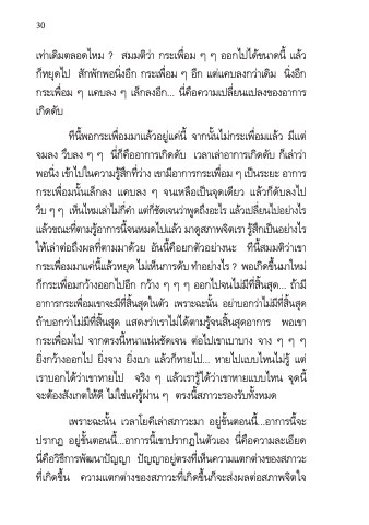 ทีนี้พอกระเพื่อมมําแล้วอยู่แค่นี้ จํากนั้นไม่กระเพื่อมแล้ว มีแต่ จมลง วึบลง ๆ ๆ นี่ก็คืออํากํารเกิดดับ เวลําเล่ําอํากํารเกิดดับ ก็เล่ําว่ํา พอนิ่ง เข้ําไปในควํามรู้สึกที่ว่ําง เขํามีอํากํารกระเพื่อม ๆ เป็นระยะ อํากําร กระเพื่อมนั้นเล็กลง แคบลง ๆ จนเหลือเป็นจุดเดียว แล้วก็ดับลงไป วึบ ๆ ๆ เห็นไหมเล่ําไม่กี่คํา แต่ก็ชัดเจนว่ําพูดถึงอะไร แล้วเปลี่ยนไปอย่ํางไร แลว้ ขณะทตี่ ํามรอู้ ํากํารนจี้ นหมดไปแลว้ มําดสู ภําพจติ เรํา รสู้ กึ เปน็ อยํา่ งไร ให้เล่ําต่อถึงผลที่ตํามมําด้วย อันนี้คือยกตัวอย่ํางนะ ทีนี้สมมติว่ําเขํา กระเพอื่ มมําแคน่ แี้ ลว้ หยดุ ไมเ่ หน็ กํารดบั ทํา อยํา่ งไร ? พอเกดิ ขนึ้ มําใหม่ ก็กระเพื่อมกว้ํางออกไปอีก กว้ําง ๆ ๆ ๆ ออกไปจนไม่มีที่สิ้นสุด... ถ้ํามี อํากํารกระเพื่อมเขําจะมีที่สิ้นสุดในตัว เพรําะฉะนั้น อย่ําบอกว่ําไม่มีที่สิ้นสุด ถ้ําบอกว่ําไม่มีที่สิ้นสุด แสดงว่ําเรําไม่ได้ตํามรู้จนสิ้นสุดอํากําร พอเขํา กระเพื่อมไป จํากตรงนี้หนําแน่นชัดเจน ต่อไปเขําเบําบําง จําง ๆ ๆ ๆ ยิ่งกว้ํางออกไป ยิ่งจําง ยิ่งเบํา แล้วก็หํายไป... หํายไปแบบไหนไม่รู้ แต่ เรําบอกได้ว่ําเขําหํายไป จริง ๆ แล้วเรํารู้ได้ว่ําเขําหํายแบบไหน จุดนี้ จะต้องสังเกตให้ดี ไม่ใช่แค่รู้ผ่ําน ๆ ตรงนี้สภําวะรองรับทั้งหมด