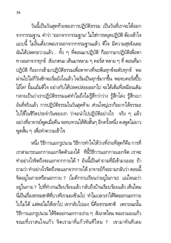 วันนี้เป็นวันสุดท้ํายของกํารปฏิบัติธรรม เป็นวันที่เรําจะได้ออก จํากกรรมฐําน คํา วํา่ “ออกจํากกรรมฐําน” ไมใ่ ชก่ ํารหยดุ ปฏบิ ตั ิ ตอ้ งเขํา้ ใจ แบบนี้ ไม่งั้นเดี๋ยวพอเรําออกจํากกรรมฐํานแล้ว ดีใจ มีควํามสุขจังเลย ฉันได้ปลดระวํางแล้ว... ทั้ง ๆ ที่ตอนมําปฏิบัติ ก็อยํากมําปฏิบัติเพื่อหํา ทํางออกจํากทุกข์ สังเกตนะ เห็นมําหลําย ๆ คอร์ส หลําย ๆ ที่ ตอนที่มํา ปฏิบัติ ก็อยํากเข้ํามําปฏิบัติธรรมเพื่อหําทํางที่จะพ้นทุกข์จะดับทุกข์ พอ ผํา่ นไปไมก่ วี่ นั ชกั จะเรมิ่ ยงั ไงแลว้ ใจเรมิ่ เปน็ ทกุ ขม์ ํากขนึ้ พอจบคอรส์ ปบ๊ึ โอ้โห! ยิ้มแย้มดีใจ อย่ํางกับได้ปลดปล่อยออกไป จะได้เต็มที่เหมือนเดิม กลํายเป็นว่ําเรําปฏิบัติธรรมแต่ทําไมถึงไม่รู้สึกว่ําว่ําง รู้สึกโล่ง รู้สึกเบํา อันที่จริงแล้ว กํารปฏิบัติธรรมในวันสุดท้ําย ส่วนใหญ่เรําก็อยํากได้ธรรมะ ไปใช้ในชีวิตประจําวันของเรํา ว่ําจะนําไปปฏิบัติอย่ํางไร จริง ๆ แล้ว อยํา่ งทอ่ี ําจํารยพ์ ดู เมอื่ คนื จะทบทวนใหฟ้ งั สนั้ ๆ อกี ครงั้ หนงึ่ คงพดู ไมย่ ําว พูดสั้น ๆ เพื่อทําควํามเข้ําใจ