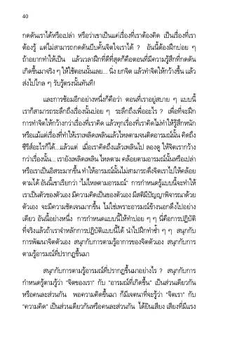 กดดันเรําได้หรือเปล่ํา หรือว่ําเขําเป็นแค่เรื่องที่เรําต้องคิด เป็นเรื่องท่ีเรํา ต้องรู้ แต่ไม่สํามํารถกดดันบีบค้ันจิตใจเรําได้ ? อันน้ีต้องฝึกบ่อย ๆ ถ้ําอยํากทําให้เป็น แล้วเวลําฝึกท่ีดีท่ีสุดก็คือตอนท่ีมีควํามรู้สึกที่กดดัน เกดิ ขน้ึ มําจรงิ ๆ ใหใ้ ชต้ อนนน้ั เลย... นง่ิ ยกจติ แลว้ ทํา จติ ใหก้ ว้ํางขนึ้ แลว้ ส่งไปไกล ๆ รับรู้ตรงน้ันทันที!
