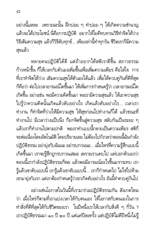 หลํายคนปฏิบัติได้ดี แต่ถ้ําอยํากให้สติเรําดีขึ้น สภําวธรรม ก้ําวหน้ําขึ้น ก็ให้เวลํากับตัวเองเพิ่มขึ้นเพื่อเพิ่มควํามเพียร คือใส่ใจ กําร ที่เรําทําจิตให้ว่ําง เติมควํามสุขให้ตัวเองได้แล้ว เพื่อให้ควบคู่กันที่ดีที่สุด กค็ อื วํา่ ตอ่ ไปเวลําอํารมณใ์ ดขนึ้ มํา ใหเ้ พมิ่ กํารกํา หนดรวู้ ํา่ เวลําอํารมณใ์ ด เกิดขึ้น อย่ํางเช่น พอมีควํามคิดขึ้นมํา พอเรํามีควํามสุขแล้ว ให้เอําควํามสุข ไปรู้ว่ําควํามคิดนั้นเกิดแล้วดับอย่ํางไร เกิดแล้วดับอย่ํางไร... เวลําเรํา ทํางําน ก็ทําจิตที่ว่ํางให้มีควํามสุข ให้สุขก่อนไปทํางํานก็ได้ แล้วขณะที่ ทํางํานไป มีเวลําว่ํางแป๊บนึง ก็ยกจิตขึ้นสู่ควํามสุข สลับกันเป็นระยะ ๆ แล้วเรําก็ทํางํานไปตํามปกติ พอเรําทําแบบนี้กลํายเป็นควํามเพียร สติก็ จะตอ่ เนอื่ งโดยอตั โนมตั ิ โดยปรยิ ํายเลย ไมต่ อ้ งไปกงั วลวํา่ ตอนนฉี้ นั กํา ลงั ปฏบิ ตั ธิ รรม อยํา่ ยงุ่ กบั ฉนั นะ อยํา่ รบกวนนะ... เมอื่ ไหรท่ คี่ วํามรสู้ กึ แบบนี้ เกิดขึ้นมํา เรําจะรู้สึกถูกรบกวนเสมอ เพรําะเรําแคบไป แค่บอกตัวเองว่ํา ตอนนี้เรํากําลังปฏิบัติธรรมก็พอ แล้วพอมีอํารมณ์อะไรขึ้นมํากระทบ เรํา รู้แล้วเขําดับแบบนี้ เรํารู้แล้วเขําดับแบบนี้... เรําก็กําหนดไป ไม่ใช่ไปห้ําม เขํามํายุ่งกับเรํา แต่เรําต้องกําหนดรู้ว่ําเขําเกิดดับอย่ํางไร อันนี้ทําควบคู่กันไป