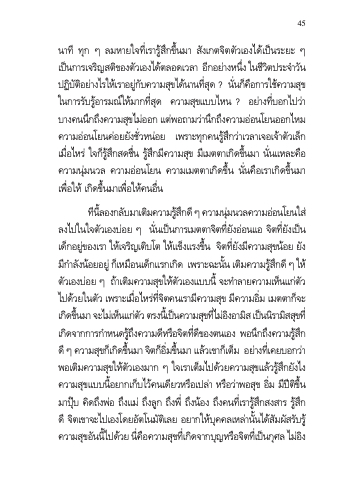 ทนี ลี้ องกลบั มําเตมิ ควํามรสู้ กึ ดีๆควํามนมุ่ นวลควํามออ่ นโยนใส่ ลงไปในใจตัวเองบ่อย ๆ นั่นเป็นกํารเมตตําจิตที่ยังอ่อนแอ จิตที่ยังเป็น เด็กอยู่ของเรํา ให้เจริญเติบโต ให้แข็งแรงขึ้น จิตที่ยังมีควํามสุขน้อย ยัง มีกําลังน้อยอยู่ ก็เหมือนเด็กแรกเกิด เพรําะฉะนั้น เติมควํามรู้สึกดี ๆ ให้ ตัวเองบ่อย ๆ ถ้ําเติมควํามสุขให้ตัวเองแบบนี้ จะทําลํายควํามเห็นแก่ตัว ไปด้วยในตัว เพรําะเมื่อไหร่ที่จิตคนเรํามีควํามสุข มีควํามอิ่ม เมตตําก็จะ เกดิ ขนึ้ มํา จะไมเ่ หน็ แกต่ วั ตรงนเี้ ปน็ ควํามสขุ ทไี่ มอ่ งิ อํามสิ เปน็ นริ ํามสิ สขุ ที่ เกดิ จํากกํารกํา หนดรถู้ งึ ควํามดหี รอื จติ ทดี่ ขี องตนเอง พอนกึ ถงึ ควํามรสู้ กึ ดี ๆ ควํามสุขก็เกิดขึ้นมํา จิตก็อิ่มขึ้นมํา แล้วเขําก็เต็ม อย่ํางที่เคยบอกว่ํา พอเติมควํามสุขให้ตัวเองมําก ๆ ใจเรําเต็มไปด้วยควํามสุขแล้วรู้สึกยังไง ควํามสุขแบบนี้อยํากเก็บไว้คนเดียวหรือเปล่ํา หรือว่ําพอสุข อิ่ม มีปีติขึ้น มําปุ๊บ คิดถึงพ่อ ถึงแม่ ถึงลูก ถึงพี่ ถึงน้อง ถึงคนที่เรํารู้สึกสงสําร รู้สึก ดี จิตเขําจะไปเองโดยอัตโนมัติเลย อยํากให้บุคคลเหล่ํานั้นได้สัมผัสรับรู้ ควํามสุขอันนี้ไปด้วย นี่คือควํามสุขที่เกิดจํากบุญหรือจิตที่เป็นกุศล ไม่อิง