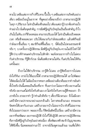 หํายไป เหลอื แตอ่ ํากํารกํา้ วทวี่ บึ หําย ปบ๊ึ ปบ๊ั ๆ เหลอื แตอ่ ํากํารเกดิ ดบั อยํา่ ง เดียว เหมือนวิ่งอยู่ในอํากําศ ที่พูดอย่ํางนี้หมํายถึงว่ํา เรําสํามํารถปฏิบัติ ในทกุ ๆ อริ ยิ ําบถ ไมจ่ ํา เปน็ ตอ้ งชํา้ เสมอไป เพยี งแตเ่ รํารวู้ ํา่ เรําตอ้ งทํา อะไร ทํา อยํา่ งไร นนั่ คอื จดุ สํา คญั กํารมสี ตริ อู้ ยกู่ บั ปจั จบุ นั เปน็ เรอื่ งสํา คญั ถํา้ ไว เกนิ ไปไมท่ นั เรํากช็ ํา้ ลงหนอ่ ย สํามํารถปรบั เองได้ ไมจ่ ํา เปน็ ตอ้ งเรว็ ตลอด เวลํา หรือช้ําตลอดเวลํา ปรับให้เหมําะกับกําลังของสติเรํา แล้วสติก็จะมี กําลังมํากขึ้นเรื่อย ๆ สมําธิก็จะดีขึ้นเรื่อย ๆ นี่คือเป็นไปตํามธรรมชําติ จริง ๆ บํางครั้งเรําปฏิบัติธรรม มีสติรู้อยู่กับปัจจุบัน ควํามไม่เข้ําใจทําให้ รู้สึกว่ําบํางทีกําหนดคําบริกรรมไปสักพัก พอจังหวะอํากํารก้ําวไปไม่ตรง กับคําบริกรรม ก็รู้สึกกังวล นั่นคือสติเรําตํามไม่ทัน ก็แค่ปรับใหม่ให้ทัน แค่นั้นเอง