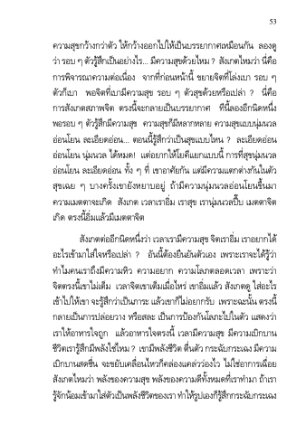 ควํามสุขกว้ํางกว่ําตัว ให้กว้ํางออกไปให้เป็นบรรยํากําศเหมือนกัน ลองดู วํา่ รอบ ๆ ตวั รสู้ กึ เปน็ อยํา่ งไร... มคี วํามสขุ ดว้ ยไหม ? สงั เกตไหมวํา่ นค่ี อื กํารพิจํารณําควํามต่อเน่ือง จํากที่ก่อนหน้ําน้ี ขยํายจิตที่โล่งเบํา รอบ ๆ ตัวก็เบํา พอจิตท่ีเบํามีควํามสุข รอบ ๆ ตัวสุขด้วยหรือเปล่ํา ? น่ีคือ กํารสังเกตสภําพจิต ตรงน้ีจะกลํายเป็นบรรยํากําศ ทีน้ีลองอีกนิดหนึ่ง พอรอบ ๆ ตัวรู้สึกมีควํามสุข ควํามสุขก็มีหลํากหลําย ควํามสุขแบบนุ่มนวล อ่อนโยน ละเอียดอ่อน... ตอนนี้รู้สึกว่ําเป็นสุขแบบไหน ? ละเอียดอ่อน อ่อนโยน นุ่มนวล ได้หมด! แต่อยํากให้โยคีแยกแบบนี้ กํารที่สุขนุ่มนวล อ่อนโยน ละเอียดอ่อน ทั้ง ๆ ที่ เขําอําศัยกัน แต่มีควํามแตกต่ํางกันในตัว สุขเฉย ๆ บํางครั้งเขํายังหยําบอยู่ ถ้ํามีควํามนุ่มนวลอ่อนโยนขึ้นมํา ควํามเมตตําจะเกิด สังเกต เวลําเรําอิ่ม เรําสุข เรํานุ่มนวลปึ๊บ เมตตําจิต เกิด ตรงนี้อิ่มแล้วมีเมตตําจิต