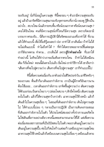ทนี เี้ พอื่ ควํามตอ่ เนอื่ งกนั ยกตวั อยํา่ งในชวี ติ ประจํา วนั เอําชวี ติ จรงิ ๆ ของเรําเลย ตื่นเช้ําก็มําเดินออกกําลังกําย เรําเป็นผู้มีรําตรีอันยําวนําน ต้องใช้เยอะ... เวลําเดินออกกําลังกําย ยกจิตขึ้นสู่ควํามว่ําง เติมควํามสุข ใหต้ วั เองกอ่ น ยนื หํายใจยําว ๆ ปลอ่ ยใจสบําย ๆ สกั อดึ ใจหนงึ่ เตมิ ควํามสขุ ลงไปในตัว แล้วก็ให้ควํามสุขกว้ํางกว่ําตัว เอําควํามสุขไว้ข้ํางหน้ํา แล้วก็ เดินเข้ําไปในควํามสุขเรื่อย ๆ ในขณะที่เดินออกกําลังกําย เดินไปดูควํามสุข ไป ให้ทําแบบนี้บ่อย ๆ กลํายเป็นกํารปฏิบัติ เป็นกํารเดินจงกรมขณะ ที่เดินออกกําลังกํายไปในตัว ได้ประโยชน์สองอย่ํางทั้งร่ํางกํายและจิตใจ ไมใ่ ชเ่ ดนิ เพอื่ กํายอยํา่ งเดยี ว ตรงนแี้ หละสํามํารถเอํามําใชไ้ ด้ แตเ่ พอื่ ควําม ต่อเนื่องของสภําวธรรมที่เป็นวิปัสสนําไปในตัว พอเรําเดินอยู่ในควํามว่ําง เดนิ อยใู่ นควํามสขุ ปบ๊ึ ตอ่ ไปกส็ นใจกํา้ วแตล่ ะกํา้ วเหยยี บถกู ควํามสขุ ไหม เอําควํามสขุ ไวข้ ํา้ งหนํา้ แลว้ กเ็ หยยี บบนควํามสขุ ไปเรอื่ ย ๆ เหยยี บแลว้ หําย