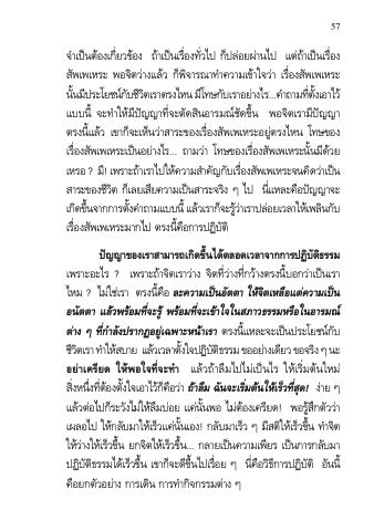 จําเป็นต้องเกี่ยวข้อง ถ้ําเป็นเรื่องทั่วไป ก็ปล่อยผ่ํานไป แต่ถ้ําเป็นเรื่อง สัพเพเหระ พอจิตว่ํางแล้ว ก็พิจํารณําทําควํามเข้ําใจว่ํา เรื่องสัพเพเหระ นนั้ มปี ระโยชนก์ บั ชวี ติ เรําตรงไหน มโี ทษกบั เรําอยํา่ งไร...คํา ถํามทตี่ งั้ เอําไว้ แบบนี้ จะทําให้มีปัญญําที่จะตัดสินอํารมณ์ชัดขึ้น พอจิตเรํามีปัญญํา ตรงนี้แล้ว เขําก็จะเห็นว่ําสําระของเรื่องสัพเพเหระอยู่ตรงไหน โทษของ เรื่องสัพเพเหระเป็นอย่ํางไร... ถํามว่ํา โทษของเรื่องสัพเพเหระนั้นมีด้วย เหรอ ? มี! เพรําะถ้ําเรําไปให้ควํามสําคัญกับเรื่องสัพเพเหระจนคิดว่ําเป็น สําระของชีวิต ก็เลยเสียควํามเป็นสําระจริง ๆ ไป นี่แหละคือปัญญําจะ เกดิ ขนึ้ จํากกํารตงั้ คํา ถํามแบบนี้ แลว้ เรํากจ็ ะรวู้ ํา่ เรําปลอ่ ยเวลําใหเ้ พลนิ กบั เรื่องสัพเพเหระมํากไป ตรงนี้คือกํารปฏิบัติ