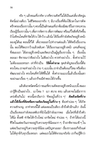 จริง ๆ แล้วขณะที่เรําคิด บํางทีควํามคิดก็ไม่ได้เป็นแค่เดี๋ยวคิดนู่น คิดนี่อย่ํางเดียว ในชีวิตของเรําจริง ๆ มีบํางเรื่องที่ต้องใช้เวลําในกํารคิด ตรกึ ตรองเรอื่ งรําวนนั้ ๆ ตรงนเี้ ปน็ ลกั ษณะทเี่ รําตอ้ งมสี มําธใิ นกํารทบทวน เ ร ยี น ร เ้ ู ร อื ่ ง ร ํา ว น นั ้ ๆ เ พ อื ่ ก ํา ร จ ดั ก ํา ร เ พ อื ่ ก ํา ร พ ฒั น ํา ห ร อื แ ก ไ้ ข ส งิ ่ ท เี ่ ก ดิ ข นึ ้ ถํา้ โยคคี นไหนทที่ ํา จติ ใหว้ ํา่ ง ใหก้ วํา้ ง แลว้ นงิ่ ใหเ้ รอื่ งทกี่ ํา ลงั คดิ เกดิ อยขู่ ํา้ งหนํา้ ลองดูได้นะ ตอนนี้ก็ได้ เดี๋ยวจะออกไปทํางํานต่อแล้ว ให้คิดถึงเรื่องงําน นั้น ลองให้จิตเรํากว้ํางแล้วหลับตํา ให้เรื่องงํานมําอยู่ข้ํางหน้ํา แทนที่จะอยู่ ที่สมองเรํา ให้เขําอยู่ข้ํางหน้ําและจิตเรําเป็นผู้ดูเรื่องรําวนั้น ๆ เรื่องนั้น ลอยมํา พิจํารณําว่ําดีอย่ํางไร ไม่ดีอย่ํางไร ควรทําอย่ํางไร... ตั้งคําถํามไว้ ไม่ต้องเยอะหรอก เท่ําที่จําเป็น วิธีตั้งคาถาม จุดสําคัญของเร่ืองนี้คือ ตรงไหน เรําจะทําอย่ํางไร ง่ําย ๆ แบบนั้น เรําจําเป็นต้องแก้ไหม หรือต้อง พัฒนําอย่ํางไร ตรงไหนที่ทําให้ดีขึ้นได้ ตั้งคําถํามแบบนี้แล้วเรื่องนั้นเขํา จะผ่ํานมําเรื่อย ๆ แล้วเรําก็จะมีคําตอบได้ง่ํายขึ้น