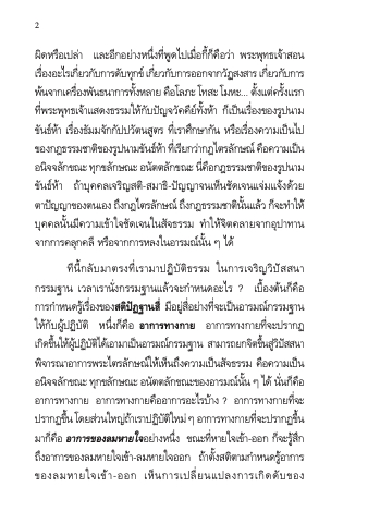 ผิดหรือเปล่ํา และอีกอย่ํางหนึ่งที่พูดไปเมื่อก้ีก็คือว่ํา พระพุทธเจ้ําสอน เรอื่ งอะไรเกยี่ วกบั กํารดบั ทกุ ข์เกยี่ วกบั กํารออกจํากวฏั สงสํารเกยี่ วกบั กําร พ้นจํากเครื่องพันธนํากํารทั้งหลําย คือโลภะ โทสะ โมหะ... ตั้งแต่ครั้งแรก ที่พระพุทธเจ้ําแสดงธรรมให้กับปัญจวัคคีย์ทั้งห้ํา ก็เป็นเรื่องของรูปนําม ขันธ์ห้ํา เรื่องธัมมจักกัปปวัตนสูตร ที่เรําศึกษํากัน หรือเรื่องควํามเป็นไป ของกฎธรรมชําตขิ องรปู นํามขนั ธห์ ํา้ ทเี่ รยี กวํา่ กฎไตรลกั ษณ์ คอื ควํามเปน็ อนจิ จลกั ขณะ ทกุ ขลกั ษณะ อนตั ตลกั ขณะ นคี่ อื กฎธรรมชําตขิ องรปู นําม ขันธ์ห้ํา ถ้ําบุคคลเจริญสติ-สมําธิ-ปัญญําจนเห็นชัดเจนแจ่มแจ้งด้วย ตําปญั ญําของตนเอง ถงึ กฎไตรลกั ษณ์ ถงึ กฎธรรมชําตนิ นั้ แลว้ กจ็ ะทํา ให้ บุคคลนั้นมีควํามเข้ําใจชัดเจนในสัจธรรม ทําให้จิตคลํายจํากอุปําทําน จํากกํารคลุกคลี หรือจํากกํารหลงในอํารมณ์นั้น ๆ ได้