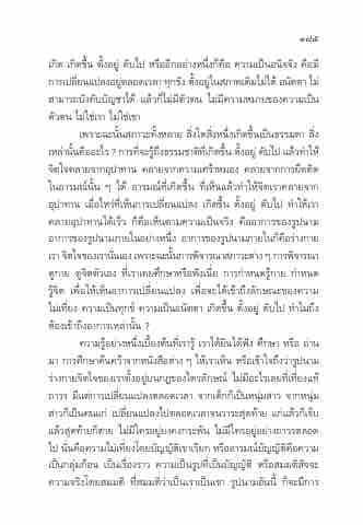 เพราะฉะนั้นสภาวะทั้งหลาย สิ่งใดสิ่งหนึ่งเกิดขึ้นเปนธรรมดา สิ่ง เหลานั้นคืออะไร ? การที่จะรูถึงธรรมชาติที่เกิดขึ้น ตั้งอยู ดับไป แลวทําให จิตใจคลายจากอุปาทาน คลายจากความเศราหมอง คลายจากการยึดติด ในอารมณนั้น ๆ ได อารมณที่เกิดขึ้น ที่เห็นแลวทําใหจิตเราคลายจาก อุปาทาน เมื่อไหรที่เห็นการเปลี่ยนแปลง เกิดขึ้น ตั้งอยู ดับไป ทําใหเรา คลายอุปาทานไดเร็ว ก็คือเห็นตามความเปนจริง คืออาการของรูปนาม อาการของรูปนามภายในอยางหนึ่ง อาการของรูปนามภายในก็คือรางกาย เรา จิตใจของเรานั่นเอง เพราะฉะนั้นการพิจารณาสภาวะตาง ๆ การพิจารณา ดูกาย ดูจิตตัวเอง ที่เราเคยศึกษาหรือฟงเนี่ย การกําหนดรูกาย กําหนด รูจิต เพื่อใหเห็นอาการเปลี่ยนแปลง เพื่อจะไดเขาถึงลักษณะของความ ไมเที่ยง ความเปนทุกข ความเปนอนัตตา เกิดขึ้น ต้ังอยู ดับไป ทําไมถึง ตองเขาถึงอาการเหลานั้น ?