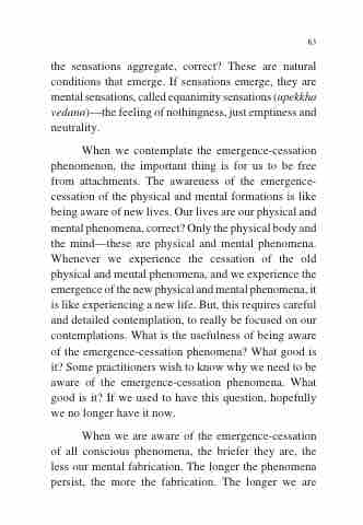 When we contemplate the emergence-cessation phenomenon, the important thing is for us to be free from attachments. The awareness of the emergence- cessation of the physical and mental formations is like being aware of new lives. Our lives are our physical and mental phenomena, correct? Only the physical body and the mind—these are physical and mental phenomena. Whenever we experience the cessation of the old physical and mental phenomena, and we experience the emergence of the new physical and mental phenomena, it is like experiencing a new life. But, this requires careful and detailed contemplation, to really be focused on our contemplations. What is the usefulness of being aware of the emergence-cessation phenomena? What good is it? Some practitioners wish to know why we need to be aware of the emergence-cessation phenomena. What good is it? If we used to have this question, hopefully we no longer have it now.