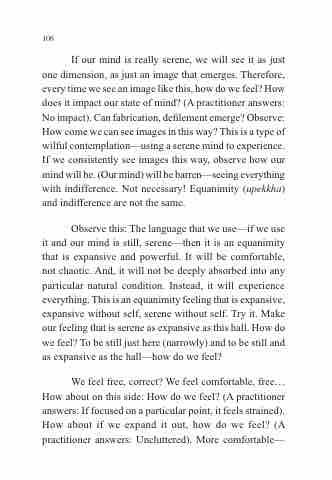 Observe this: The language that we use—if we use it and our mind is still, serene—then it is an equanimity that is expansive and powerful. It will be comfortable, not chaotic. And, it will not be deeply absorbed into any particular natural condition. Instead, it will experience everything. This is an equanimity feeling that is expansive, expansive without self, serene without self. Try it. Make our feeling that is serene as expansive as this hall. How do we feel? To be still just here (narrowly) and to be still and as expansive as the hall—how do we feel?