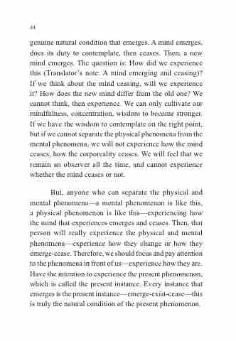 genuine natural condition that emerges. A mind emerges, does its duty to contemplate, then ceases. Then, a new mind emerges. The question is: How did we experience this (Translator’s note: A mind emerging and ceasing)? If we think about the mind ceasing, will we experience it? How does the new mind differ from the old one? We cannot think, then experience. We can only cultivate our mindfulness, concentration, wisdom to become stronger. If we have the wisdom to contemplate on the right point, but if we cannot separate the physical phenomena from the mental phenomena, we will not experience how the mind ceases, how the corporeality ceases. We will feel that we remain an observer all the time, and cannot experience whether the mind ceases or not.