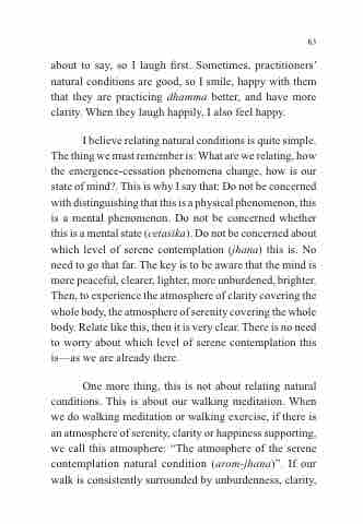 I believe relating natural conditions is quite simple. The thing we must remember is: What are we relating, how the emergence-cessation phenomena change, how is our state of mind?. This is why I say that: Do not be concerned with distinguishing that this is a physical phenomenon, this is a mental phenomenon. Do not be concerned whether this is a mental state (cetasika). Do not be concerned about which level of serene contemplation (jhana) this is. No need to go that far. The key is to be aware that the mind is more peaceful, clearer, lighter, more unburdened, brighter. Then, to experience the atmosphere of clarity covering the whole body, the atmosphere of serenity covering the whole body. Relate like this, then it is very clear. There is no need to worry about which level of serene contemplation this is—as we are already there.