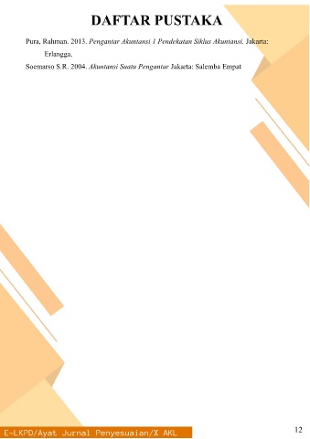 DAFTAR PUSTAKA Pura, Rahman. 2013. Pengantar Akuntansi 1 Pendekatan Siklus Akuntansi. Jakarta: Erlangga. Soemarso S.R. 2004. Akuntansi Suatu Pengantar Jakarta: Salemba Empat 12