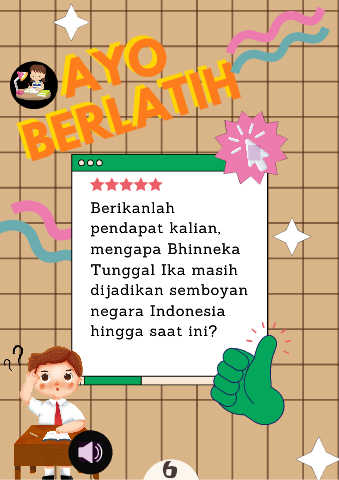 AYO AYO BERLATIH BERLATIH Berikanlah pendapat kalian, mengapa Bhinneka Tunggal Ika masih dijadikan semboyan negara Indonesia hingga saat ini? 6