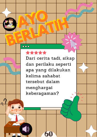AYO AYO BERLATIH BERLATIH Dari cerita tadi, sikap dan perilaku seperti apa yang dilakukan kelima sahabat tersebut dalam menghargai keberagaman? 60