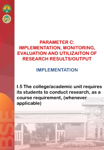PARAMETER C: IMPLEMENTATION, MONITORING, EVALUATION AND UTILIZAITON OF RESEARCH RESULTS/OUTPUT IMPLEMENTATION I.5 The college/academic unit requires its students to conduct research, as a course requirement, (whenever applicable)