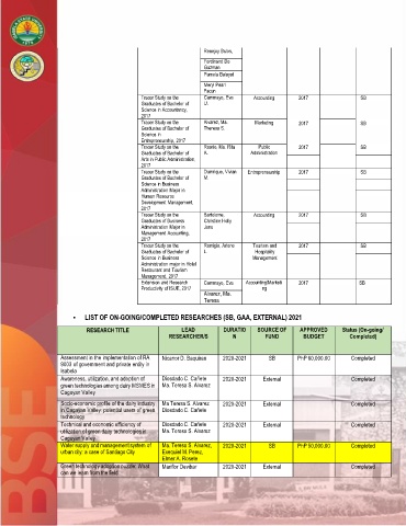 ▪ LIST OF ON-GOING/COMPLETED RESEARCHES (SB, GAA, EXTERNAL) 2021