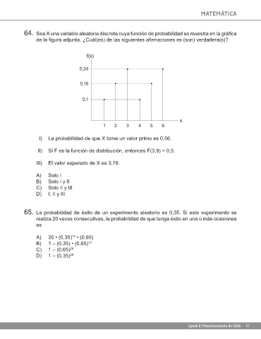 64. Sea X una variable aleatoria discreta cuya función de probabilidad se muestra en la gráfica