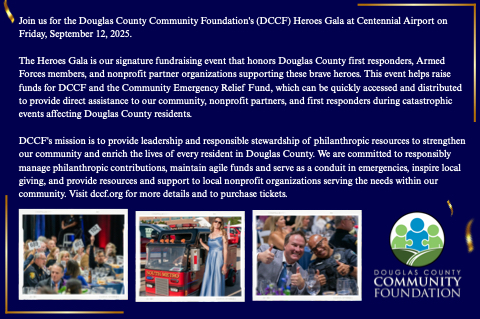 Join us for the Douglas County Community Foundation's (DCCF) Heroes Gala at Centennial Airport on Friday, September 12, 2025.