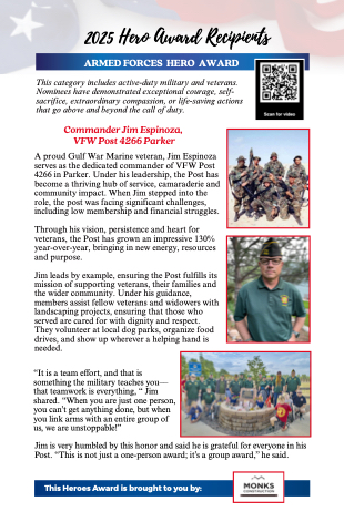 A proud Gulf War Marine veteran, Jim Espinoza serves as the dedicated commander of VFW Post 4266 in Parker. Under his leadership, the Post has become a thriving hub of service, camaraderie and community impact. When Jim stepped into the role, the post was facing significant challenges, including low membership and financial struggles.