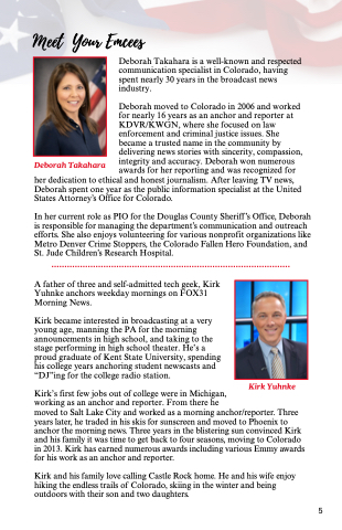 In her current role as PIO for the Douglas County Sheriff’s Office, Deborah is responsible for managing the department’s communication and outreach efforts. She also enjoys volunteering for various nonprofit organizations like Metro Denver Crime Stoppers, the Colorado Fallen Hero Foundation, and St. Jude Children’s Research Hospital.